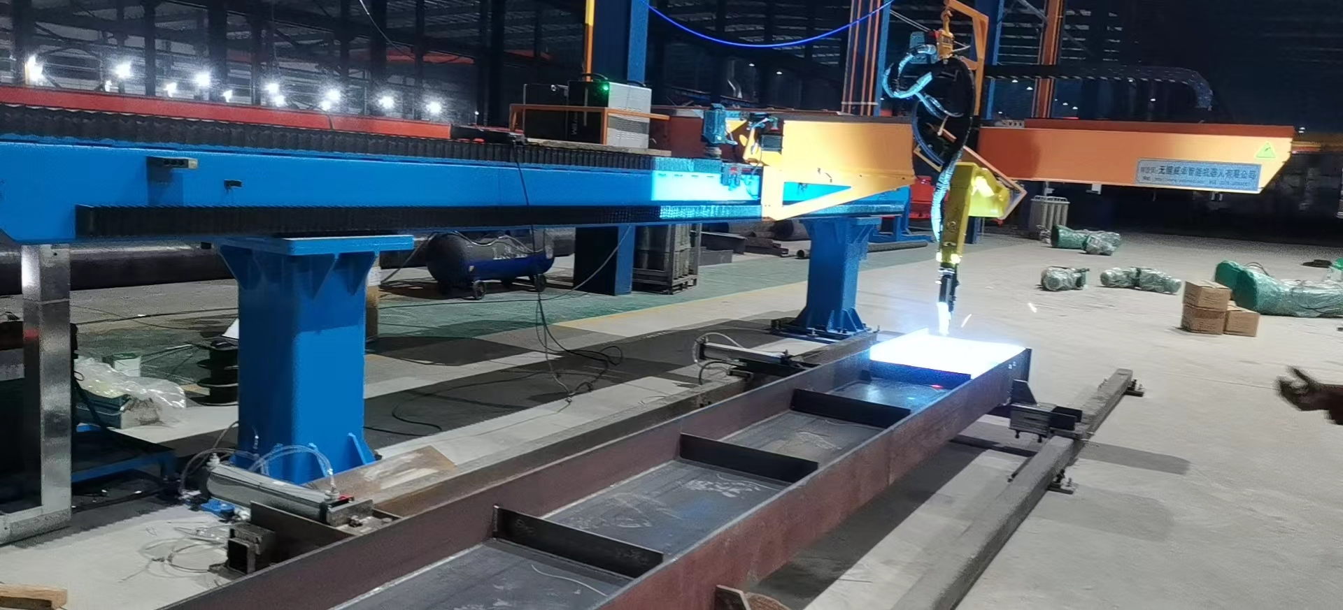 智能焊接在鋼構(gòu)行業(yè)的成功應用針對鋼結(jié)構(gòu)中常見的H型鋼等鋼梁工件,威卓設計研發(fā)了小龍門智能焊接工作站,焊槍部分使用鋼梁專用焊槍,更適用于鋼梁焊接;搭配傳感器使用,自動尋位識別焊縫,無